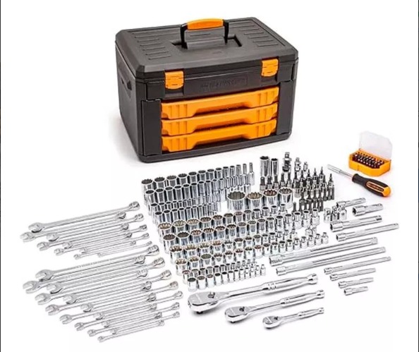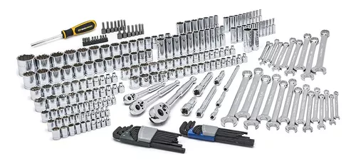 Trinquete de lágrima cromado pulido completo de 84 dientes, con palanca de encendido/apagado montada. Contiene llaves y llaves combinadas de patrón largo de 12 puntos. Cromo pulido completo SAE y métricas de 1/4, 3/8 pulgadas y 1/2 pulgadas, y enchufes estándar de 1/4 pulgadas y 3/8 pulgadas de profundidad, destornillador magnético con 30 bits incluyendo Torx, hexágono , ranurado, y Phillips